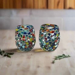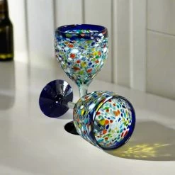 Add a festive touch to your drinkware collection with this Blue Rim Confetti Wine Glass. Hand-blown by skilled artisans in Mexico, this colorful stemless cup features a bold cobalt rim and vibrant glass pebbles embedded throughout. It holds approximately 12 ounces—perfect for wine, cocktails, or sparkling drinks.