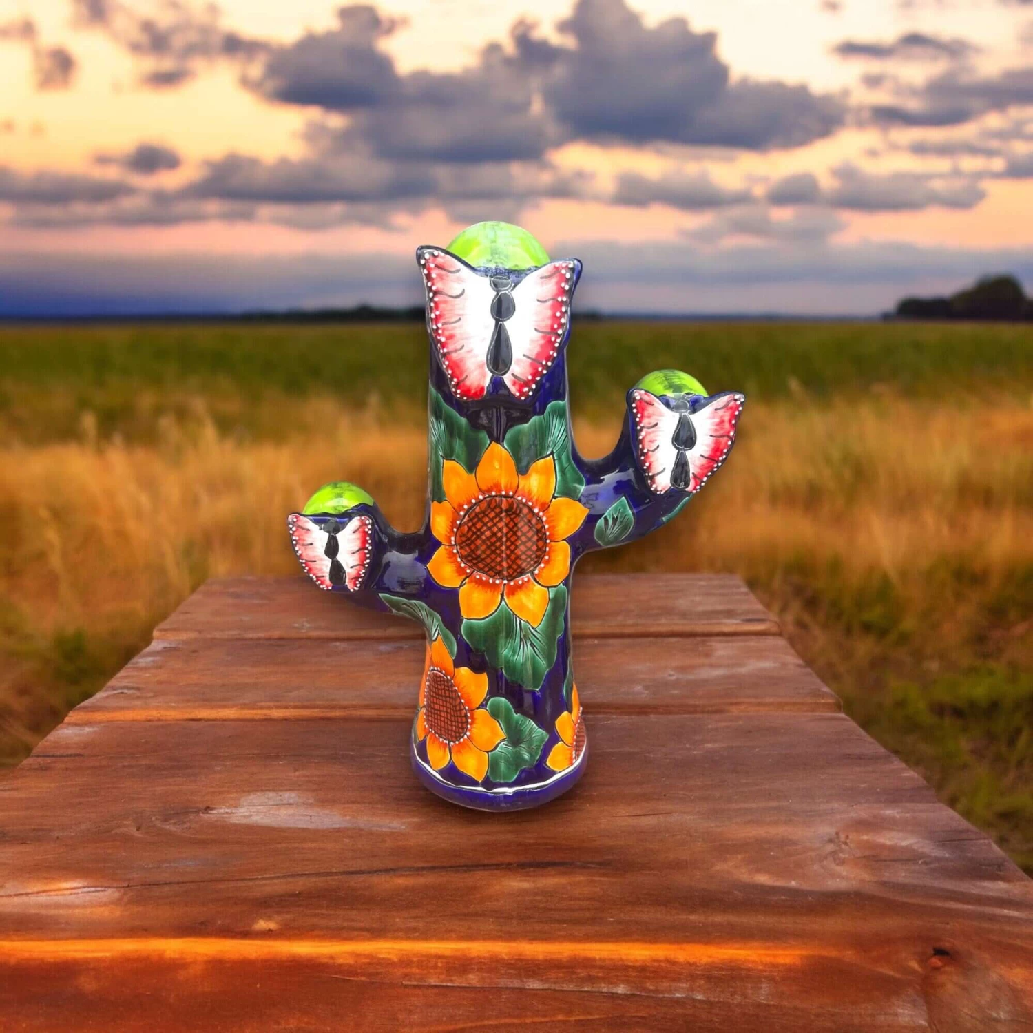 Welcome to our shop! Here, we offer a beautiful Handmade Talavera Cactus Statue, intricately painted with a vibrant sunflower design, crafted by skilled artisans in Mexico.