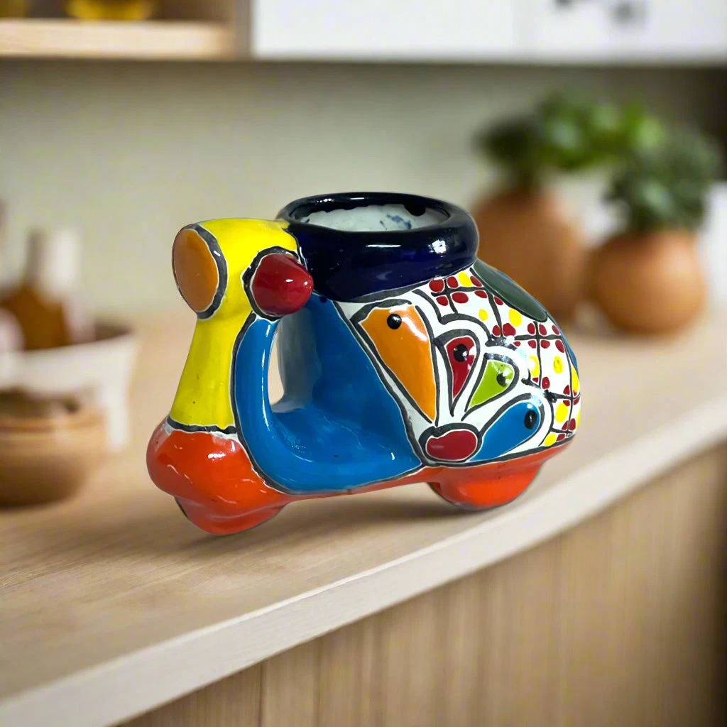 Add a vibrant touch to your space with this Talavera Scooter Planter. Handcrafted by skilled artisans in Mexico, this piece blends traditional artistry with a playful twist, making it a perfect addition to any room or collection.