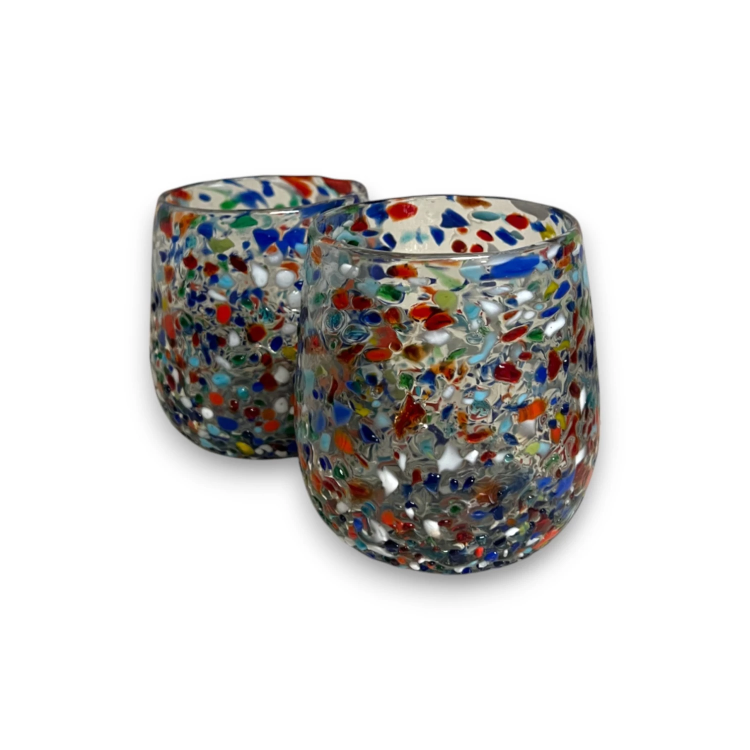 Elevate your drinkware with this Confetti Stemless Wine Glass, hand-blown by talented artisans in Mexico. Featuring a textured pebbled design and vibrant confetti pattern, each glass brings a touch of celebration to every sip. Perfect for wine lovers, this glass also works beautifully for cocktails, juice, or sparkling water.
