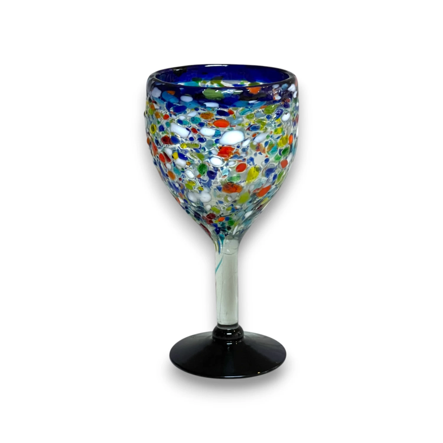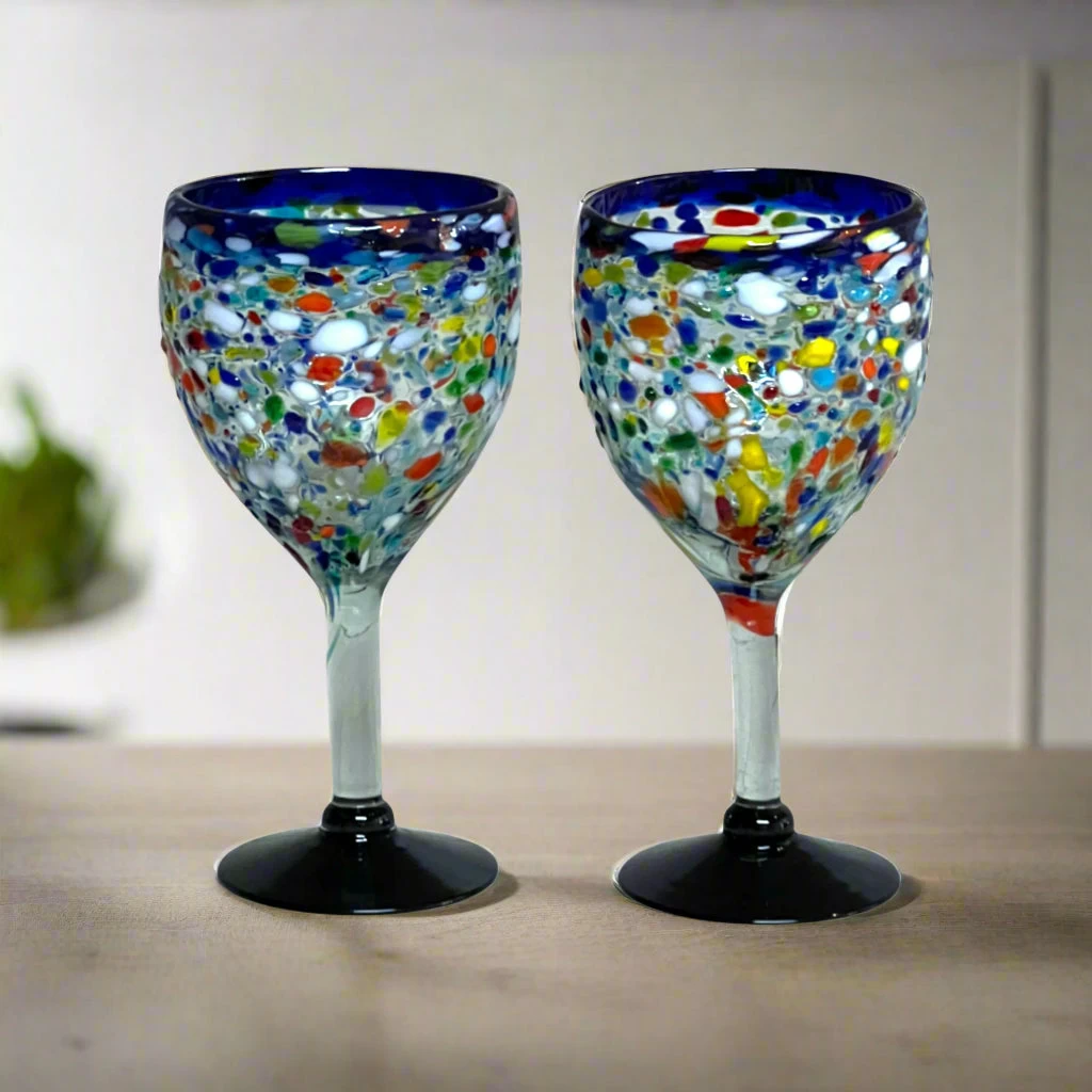 STYLE: These stunning glasses feature a vibrant confetti pattern with a cobalt blue rim, offering a playful and colorful accent to your table. The hand-blown glass adds authentic character and artistic flair.