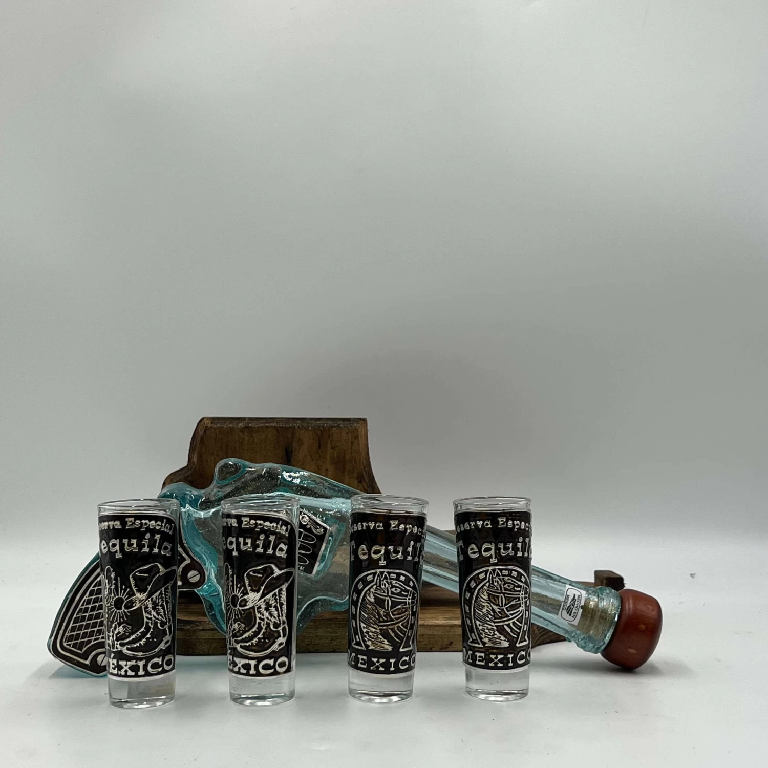 Welcome to our shop! We offer a unique and stylish Gun Decanter Set that will add a touch of charm to any occasion. Each set is handblown by skilled artisans in Mexico, ensuring exceptional craftsmanship and attention to detail. Our Gun Decanter Set features a captivating revolver design, making it a perfect gift for men who appreciate both style and fine spirits.