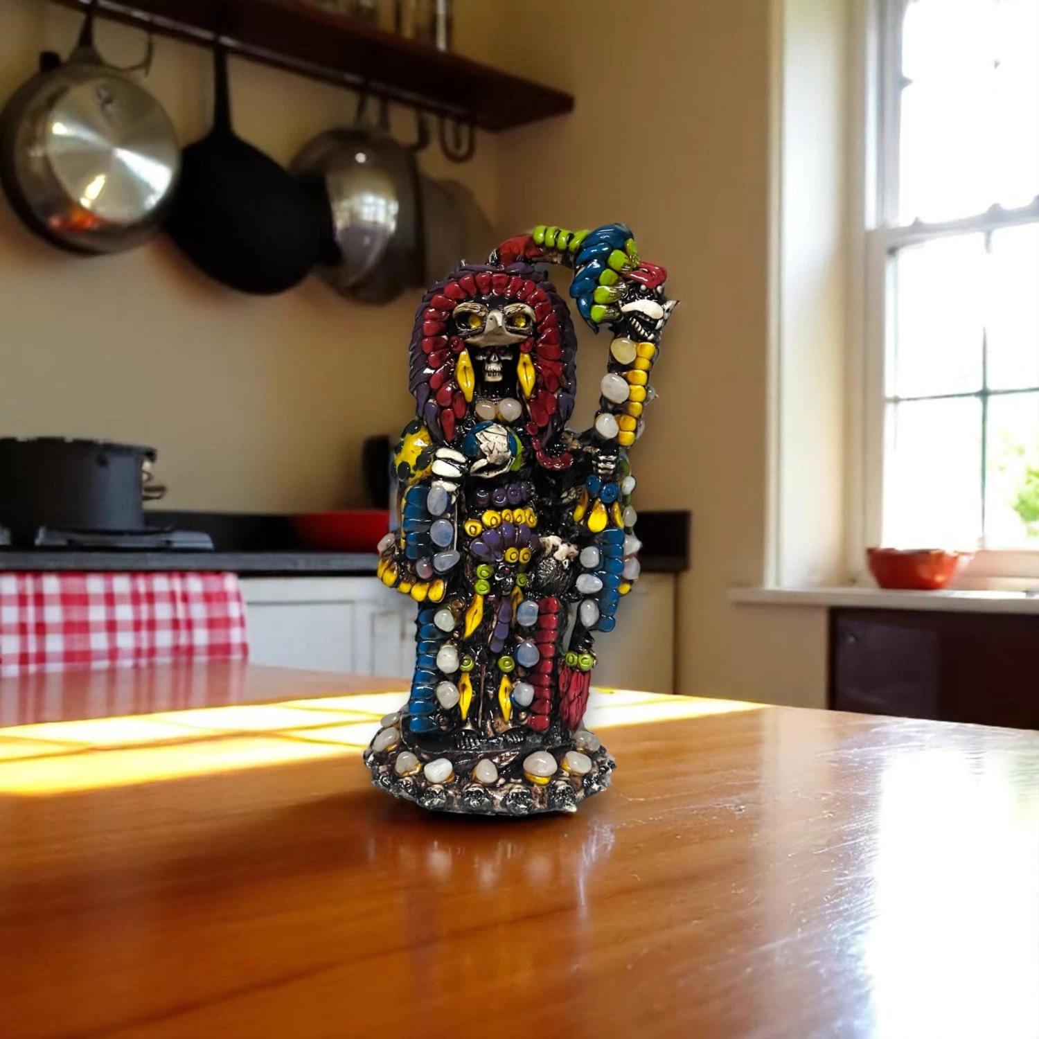 Add striking cultural presence to your space with this Handmade Aztec Warrior Statue. Featuring a bold and colorful interpretation of the Grim Reaper, this piece blends ancient Mesoamerican iconography with eye-catching modern flair—perfect for collectors or altars.