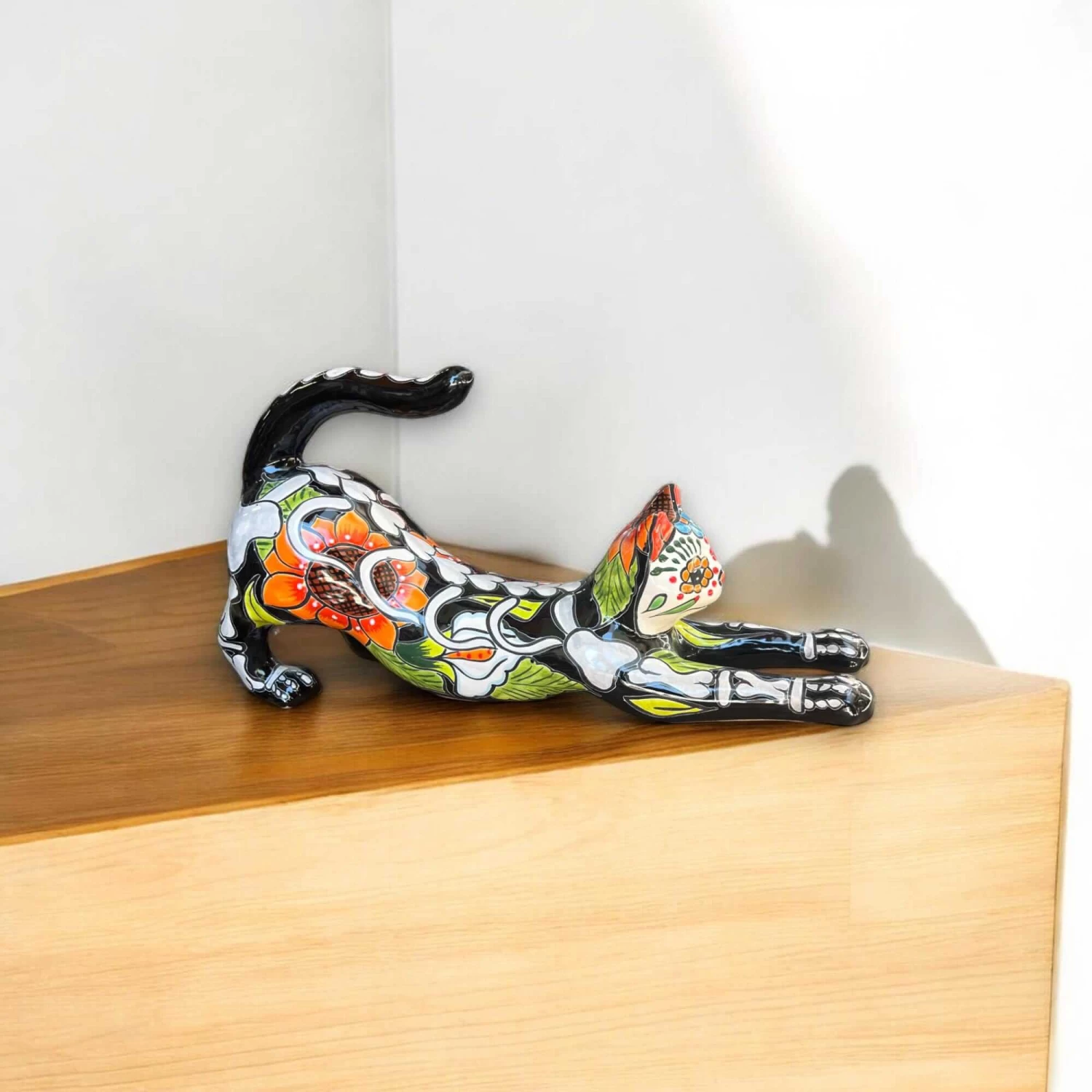 Beautiful Handmade Talavera Stretching Cat Statue, celebrating the Day of the Dead with vibrant Mexican folk art. This unique statue adds a touch of cultural charm to any space!