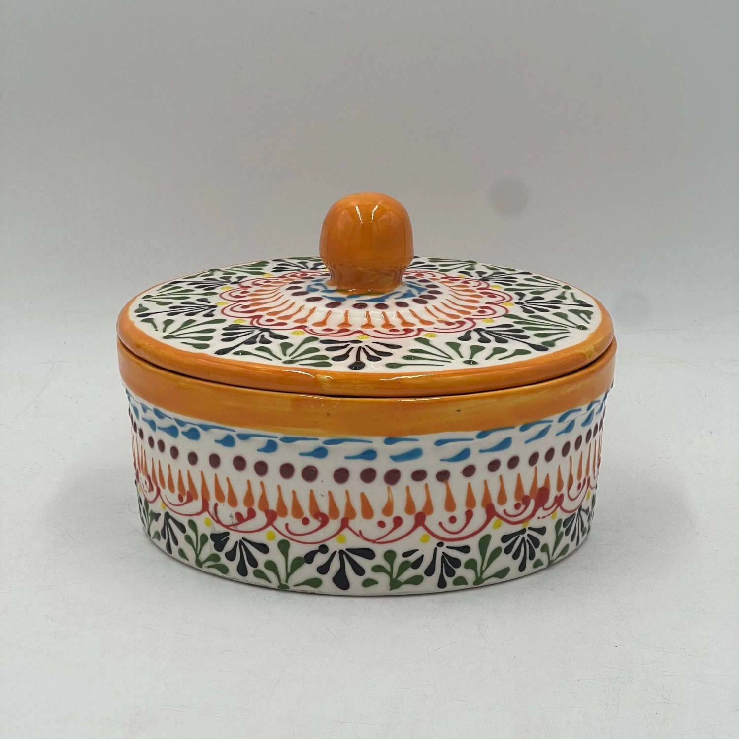 STYLE: This piece features a traditional Talavera design with intricate floral and geometric patterns in warm earth tones and rich accents. The hand-painted lid is topped with a rounded handle for easy lifting, while the body showcases repeating motifs in orange, green, and blue.