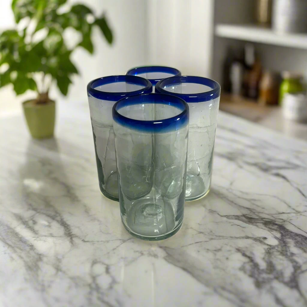STYLE: This tumbler features a classic transparent body with a deep cobalt rim—an iconic design found in traditional Mexican glassware. It pairs beautifully with both rustic and modern table settings.