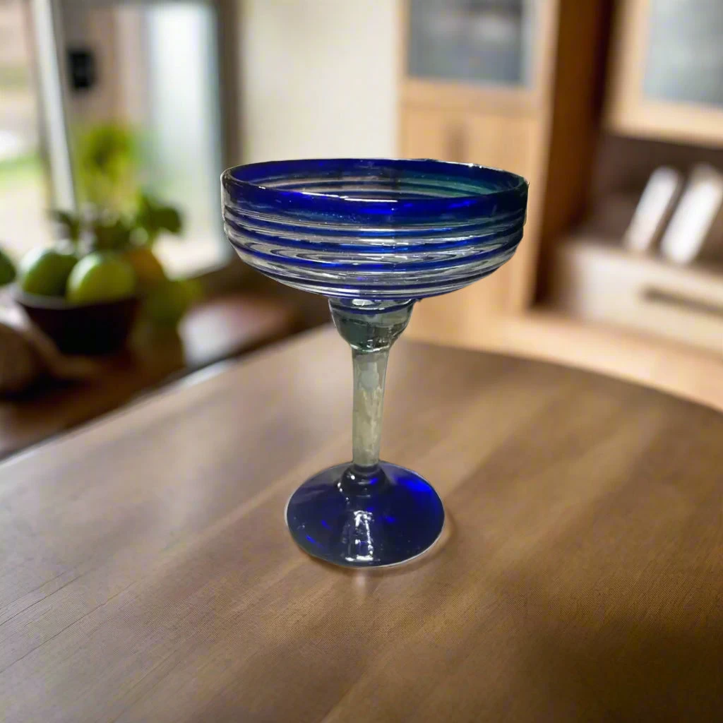 Serve your favorite cocktails with flair using this Mexican Margarita Glass. Hand-blown by skilled artisans in Mexico, this elegant glass blends timeless craftsmanship with a bold blue swirl design—perfect for parties, gifts, or your own barware collection.