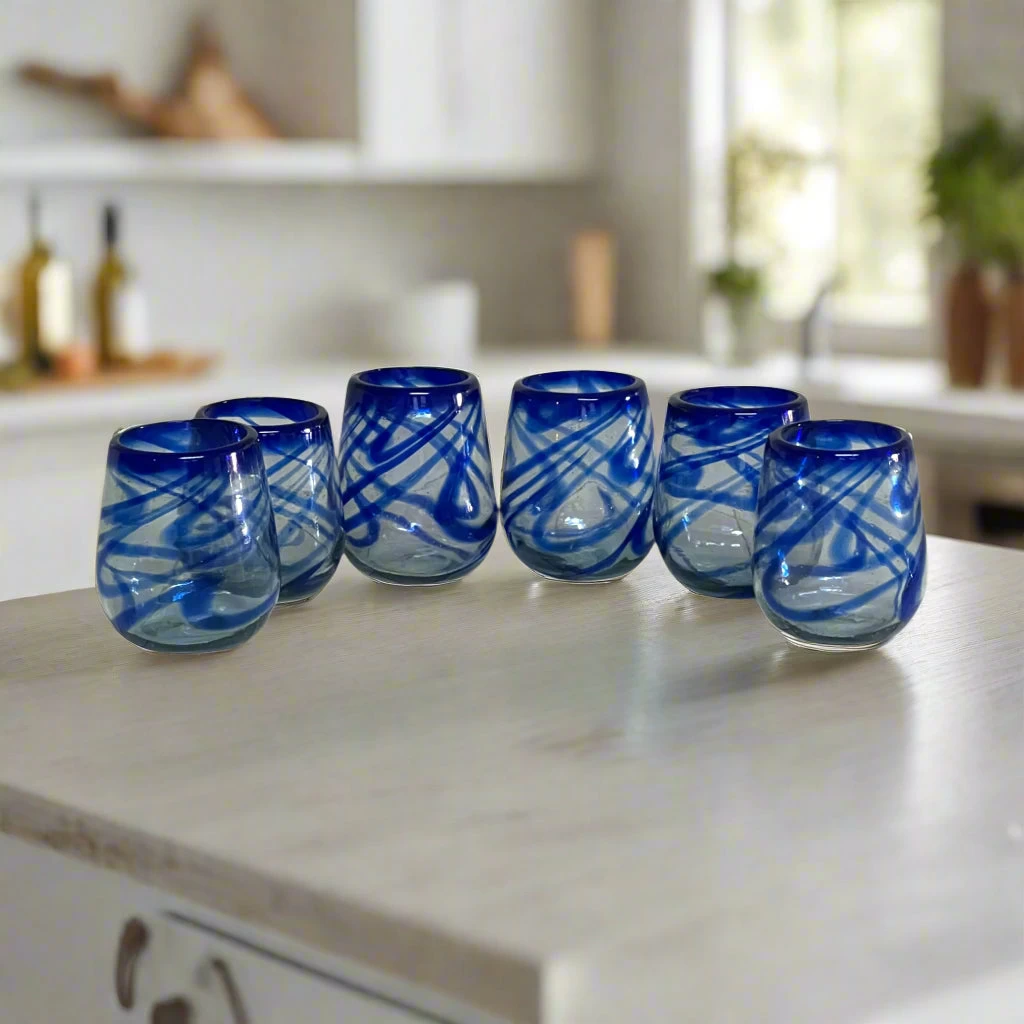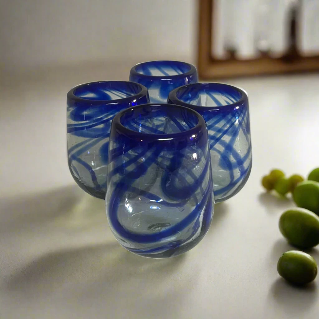STYLE: Clear glass with vibrant cobalt blue swirls flows organically around the surface, giving it a unique and eye-catching look. Each glass has a smooth rim and rounded body, perfect for wine or your favorite beverage.