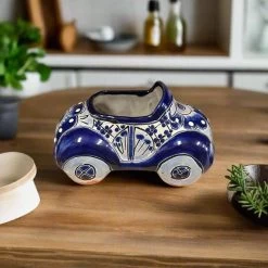 Talavera Car Planter | Small Blue & White Handmade Ceramic Pot