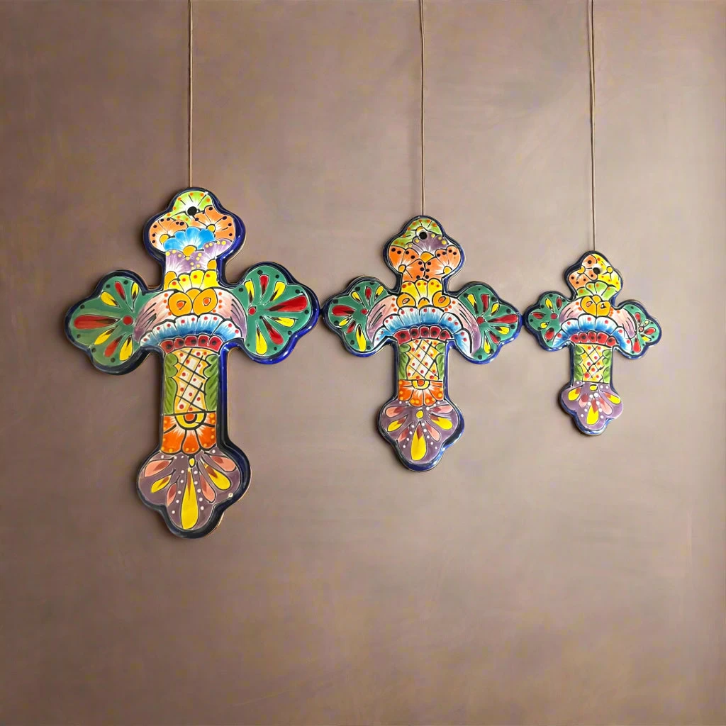 Add color and tradition to your space with this set of three handcrafted Talavera wall crosses. Made by skilled artisans in Mexico, these ceramic crosses blend spiritual symbolism with vibrant folk art, making them meaningful additions to any room or gallery wall.