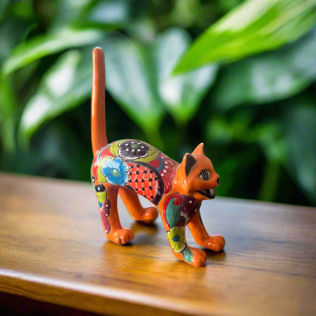 STYLE: Crafted using traditional Talavera techniques, this arched cat statue features a glossy finish with bright floral and geometric motifs, staying true to the artistry of Mexican ceramic decor.