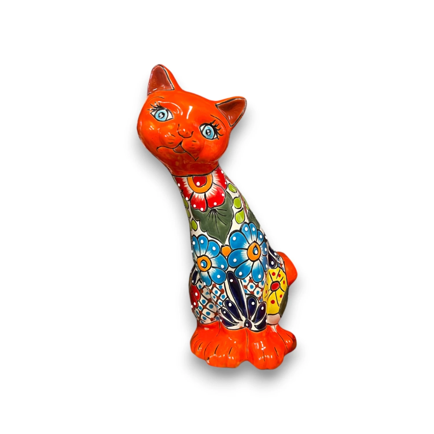 STYLE: This quirky cat tilts its head with a curious expression, giving off a playful and inquisitive vibe. Decorated in traditional Mexican Talavera motifs with a glossy finish, it’s a statement piece for cat lovers and pottery fans alike.