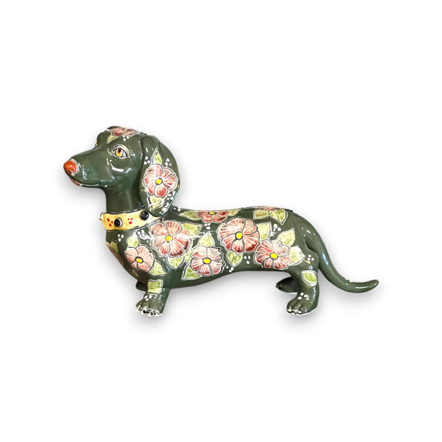 STYLE: This decorative dachshund features a forest green base with hand-painted peach-toned flowers and delicate detailing across the body. The vibrant glaze and joyful expression make it a standout accent piece for dog lovers and folk art collectors alike.