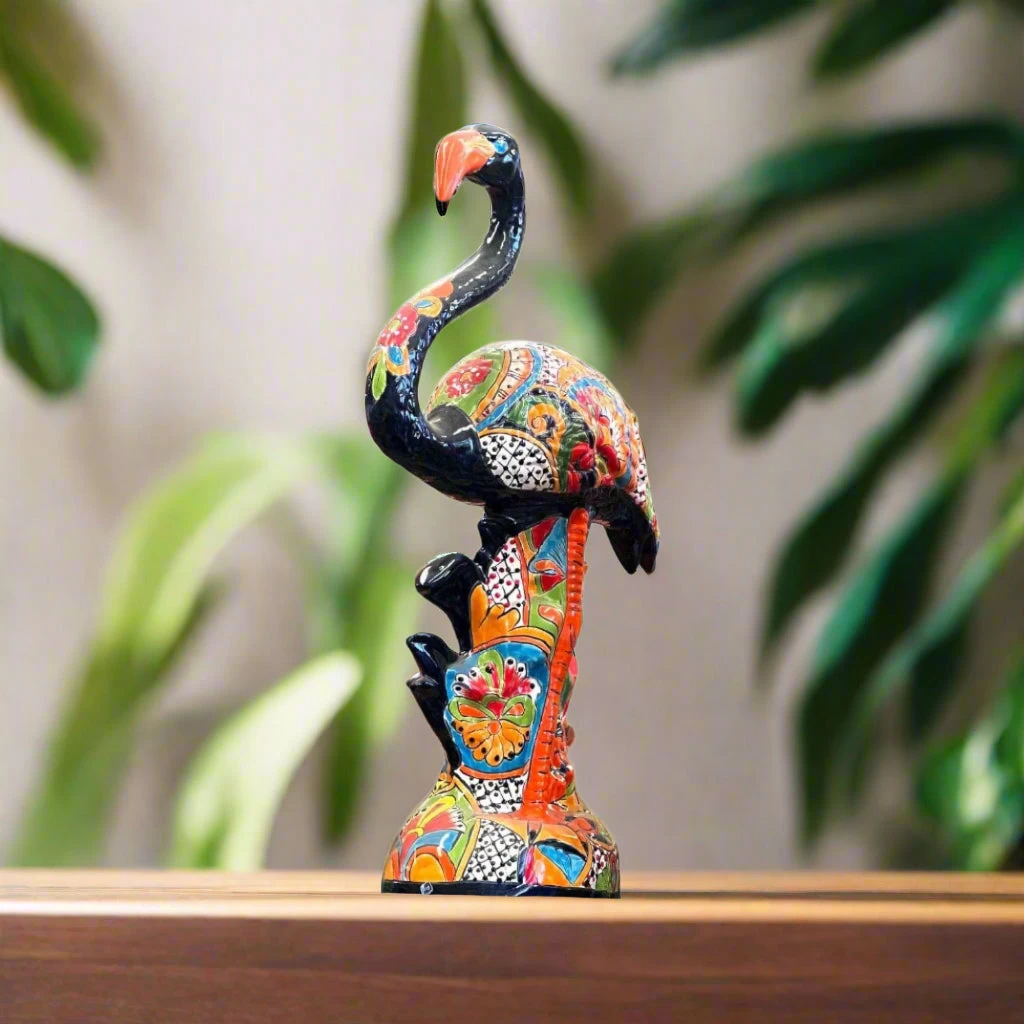STYLE: This eye-catching piece features classic Talavera floral and geometric patterns painted across the flamingo’s wings, base, and legs. Bold oranges, blues, greens, and yellows are balanced with deep black and rich detail work, giving it a festive yet elegant personality.
