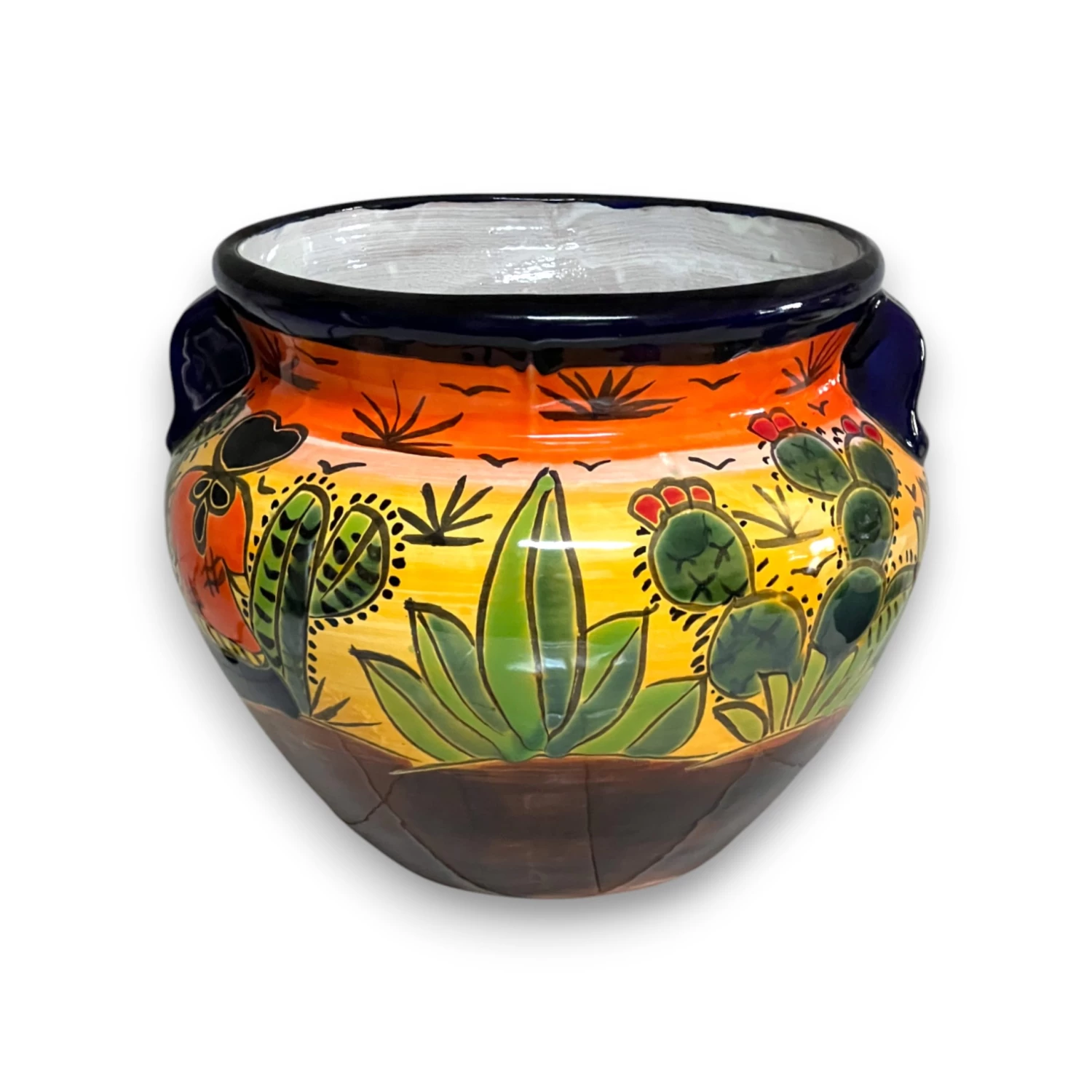 STYLE: Vivid desert artwork (sun, agave, nopal cactus) with a deep cobalt rim and small side handles for easy placement.