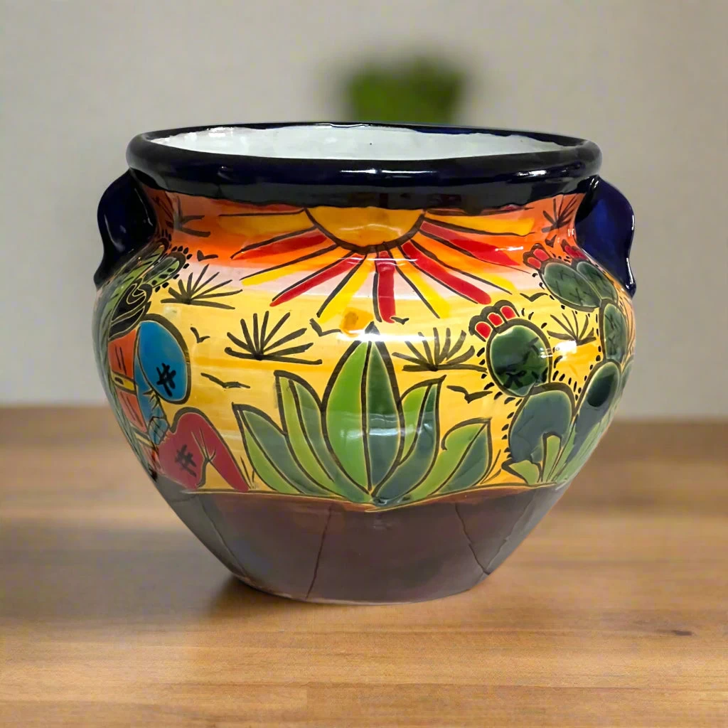 Add bold color to your space with this hand-painted Talavera flower pot featuring a desert sunrise with agave and nopal cactus. Crafted by skilled artisans in Mexico, it’s a cheerful statement piece for patios, entryways, or sunny windows.
