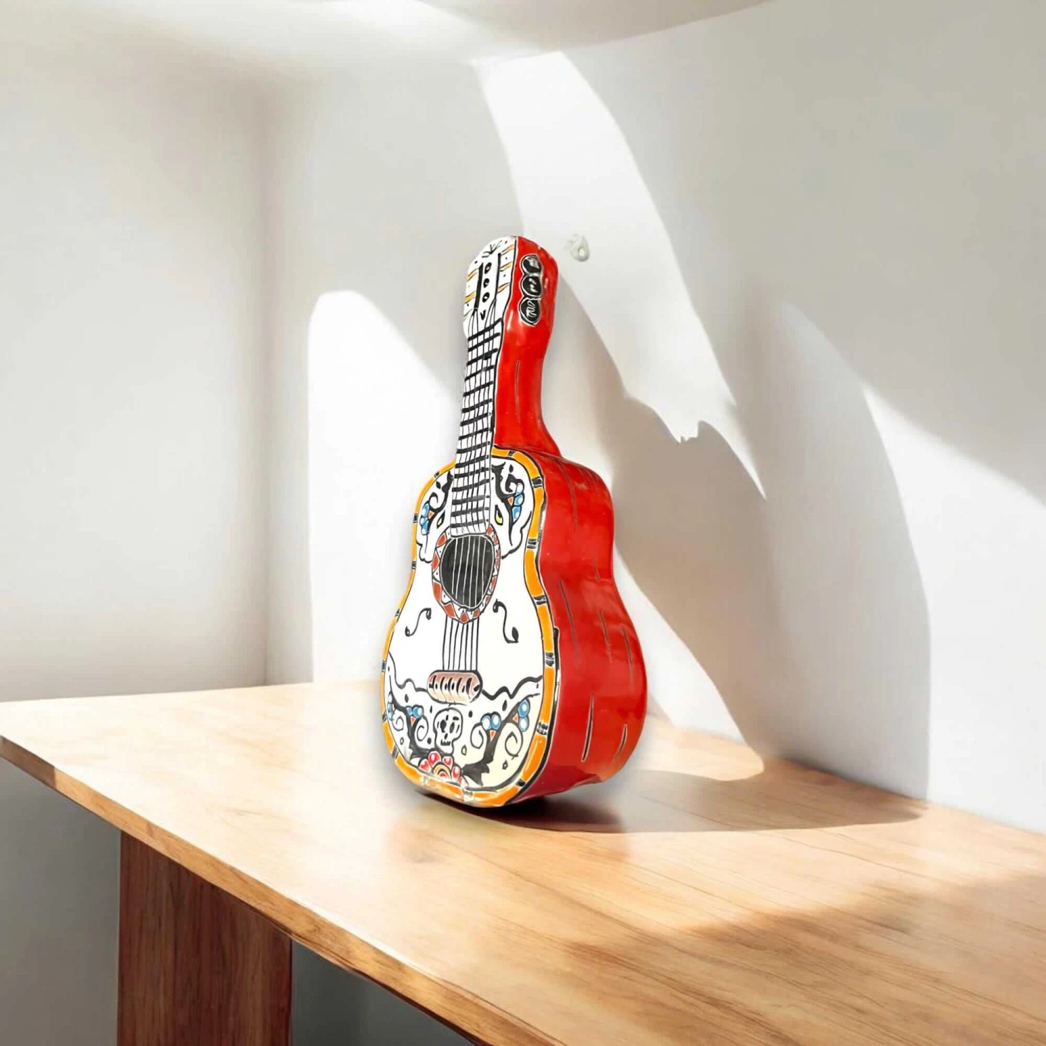 STYLE: Featuring a vibrant fusion of red, yellow, blue, and green, this sculpture is bursting with bold floral and geometric patterns. Its whimsical guitar shape and Day of the Dead-inspired details bring joyful energy and cultural depth to any space.