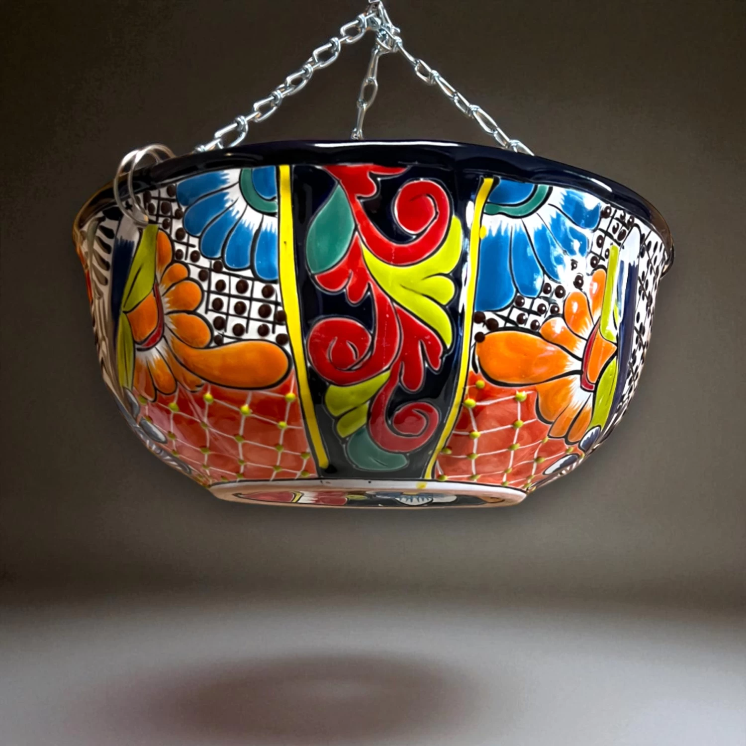 STYLE: Featuring a bold mix of colors and floral patterns, this planter showcases the rich artistry of Mexican Talavera pottery. The included metal chain allows for easy hanging on patios, balconies, or pergolas.