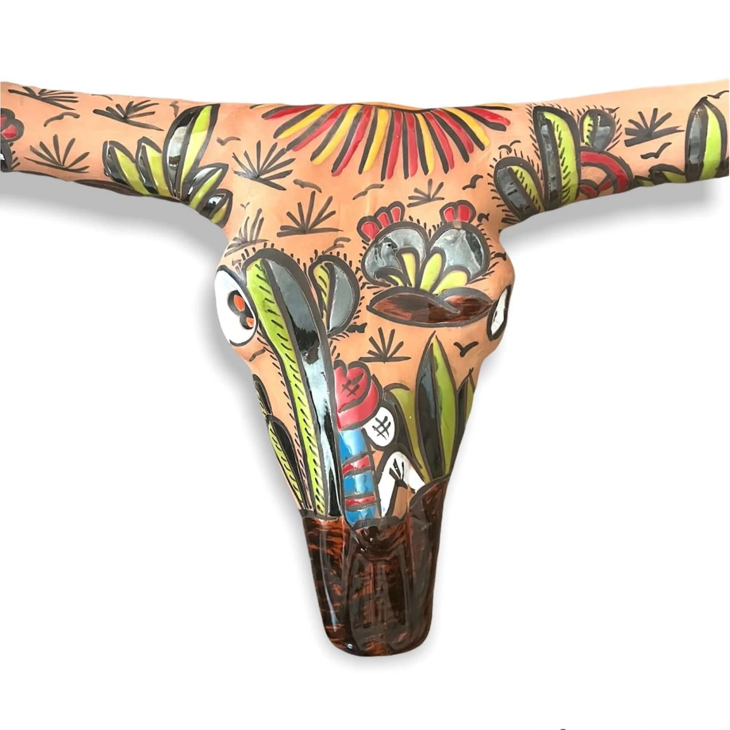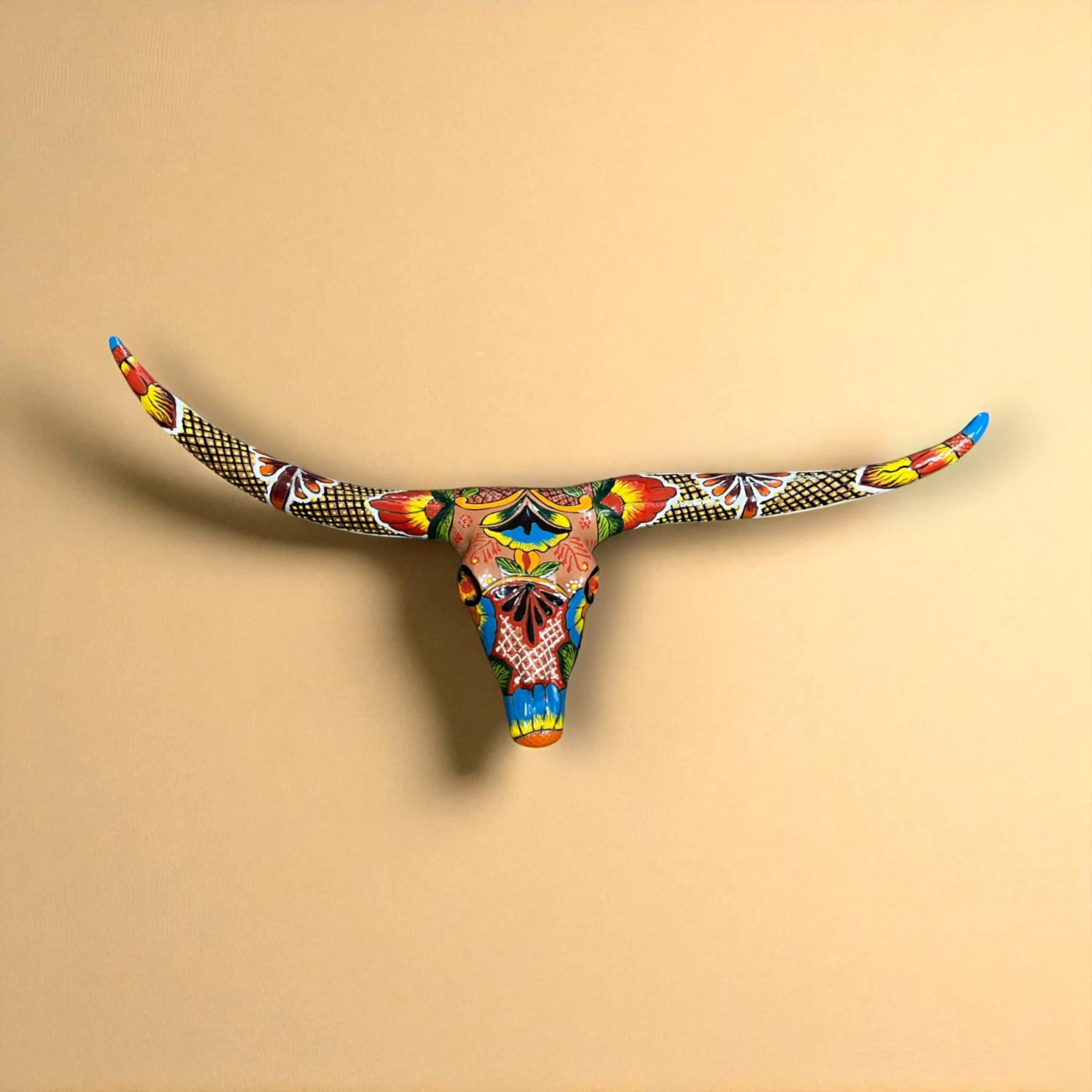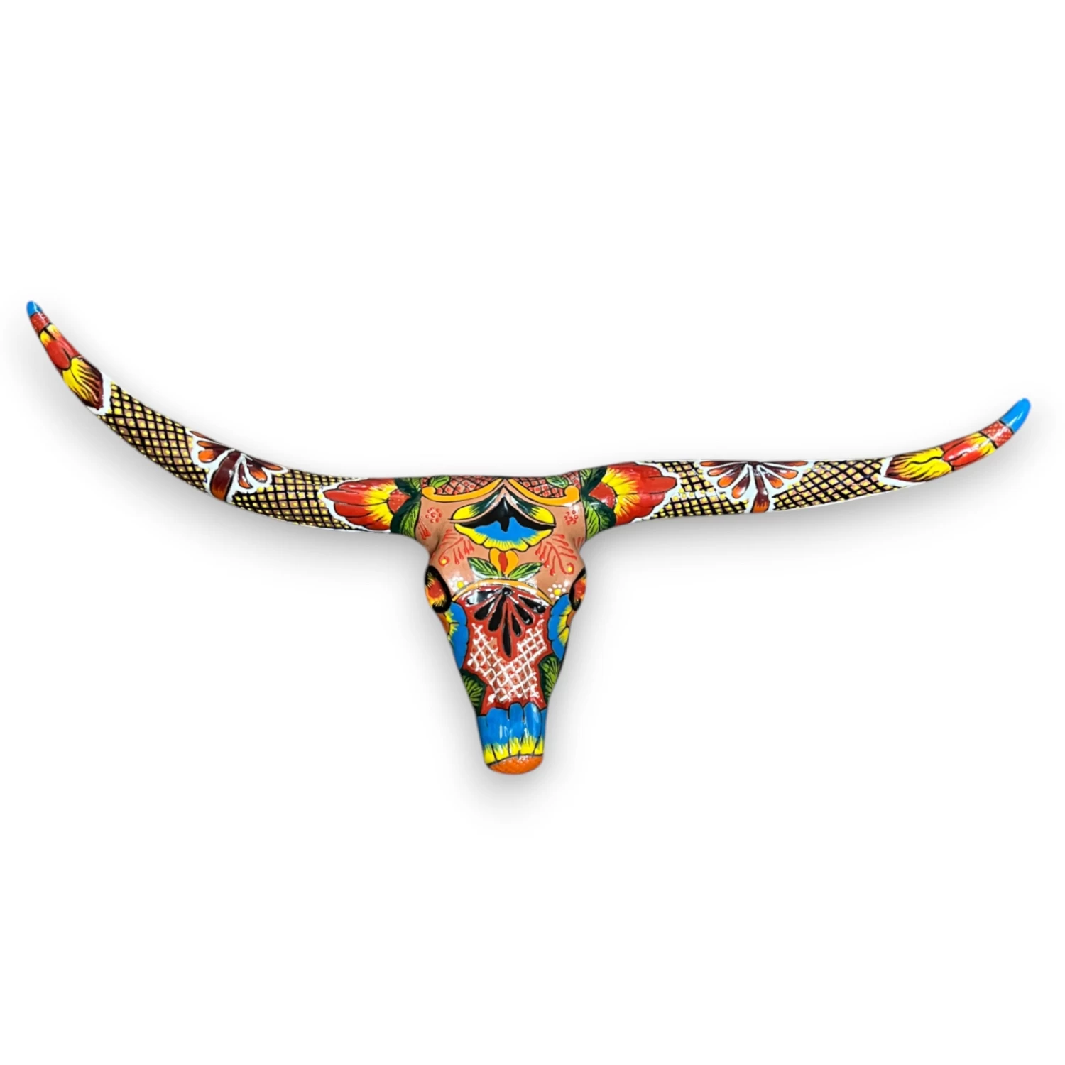 STYLE: This bull skull features vivid hand-painted patterns in iconic Talavera colors—reds, blues, yellows, and greens—on a terracotta base. Its long, curved horns and detailed face give it a bold and decorative southwestern feel.