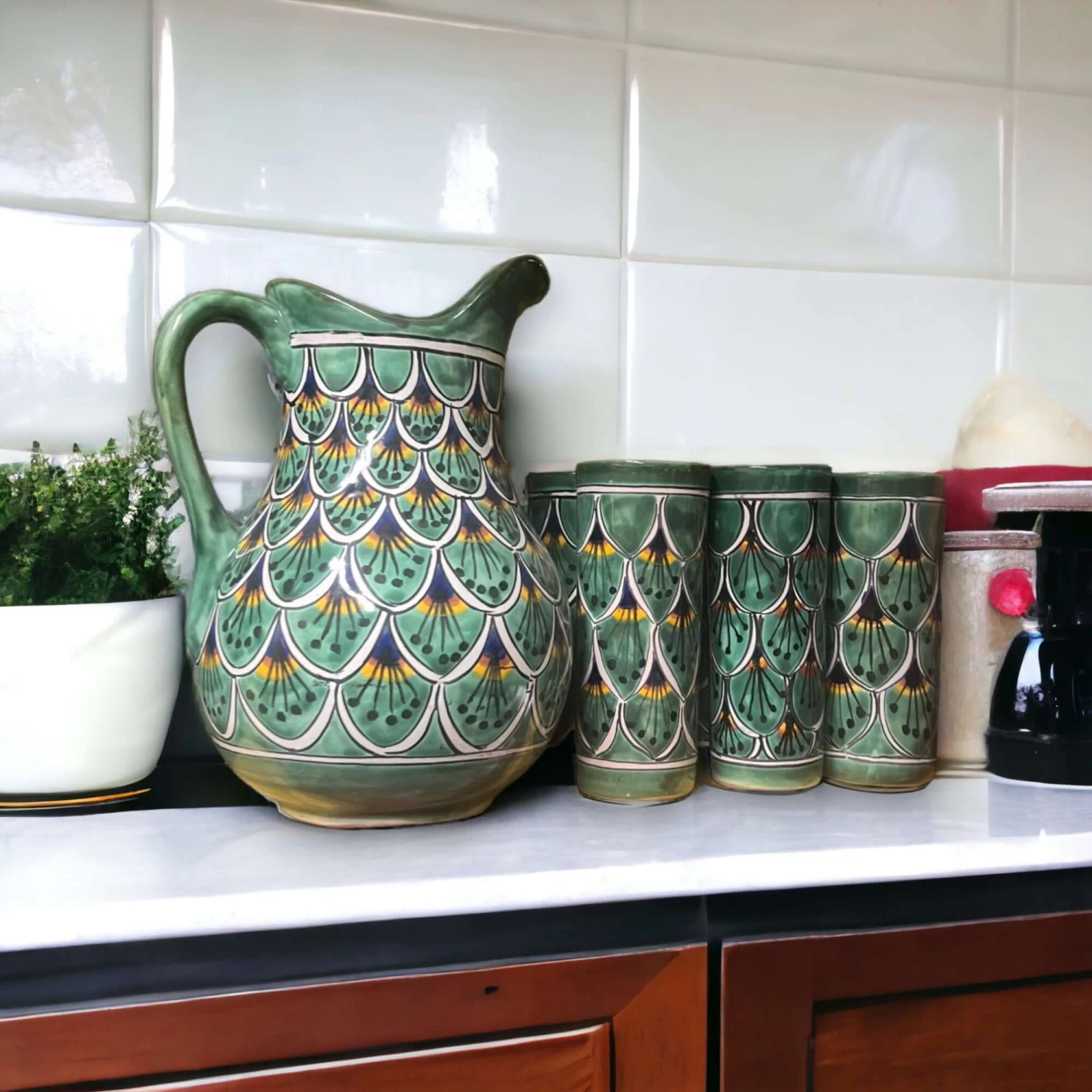 Embrace the allure of our Authentic Handmade Talavera Pitcher and 6 Cup Set, meticulously crafted by skilled artisans who pour their creativity into every piece. This ensemble is not just a collection; it’s an expression of culture and craftsmanship that will warmly grace your space.