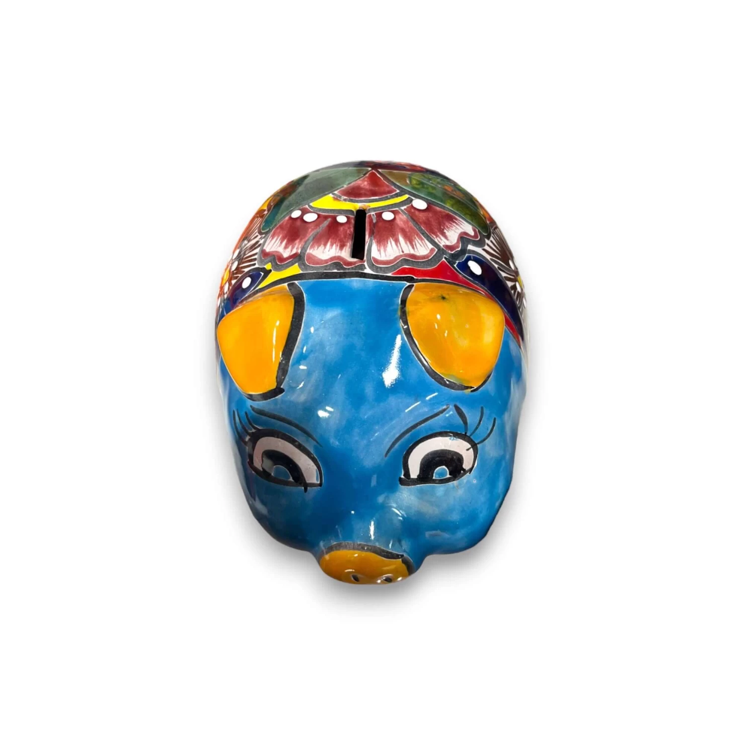 STYLE: This ceramic piggy bank features a bold orange face, yellow ears and snout, and traditional multicolor Talavera floral accents across the body. A coin slot at the top allows for easy use while keeping its adorable look intact.