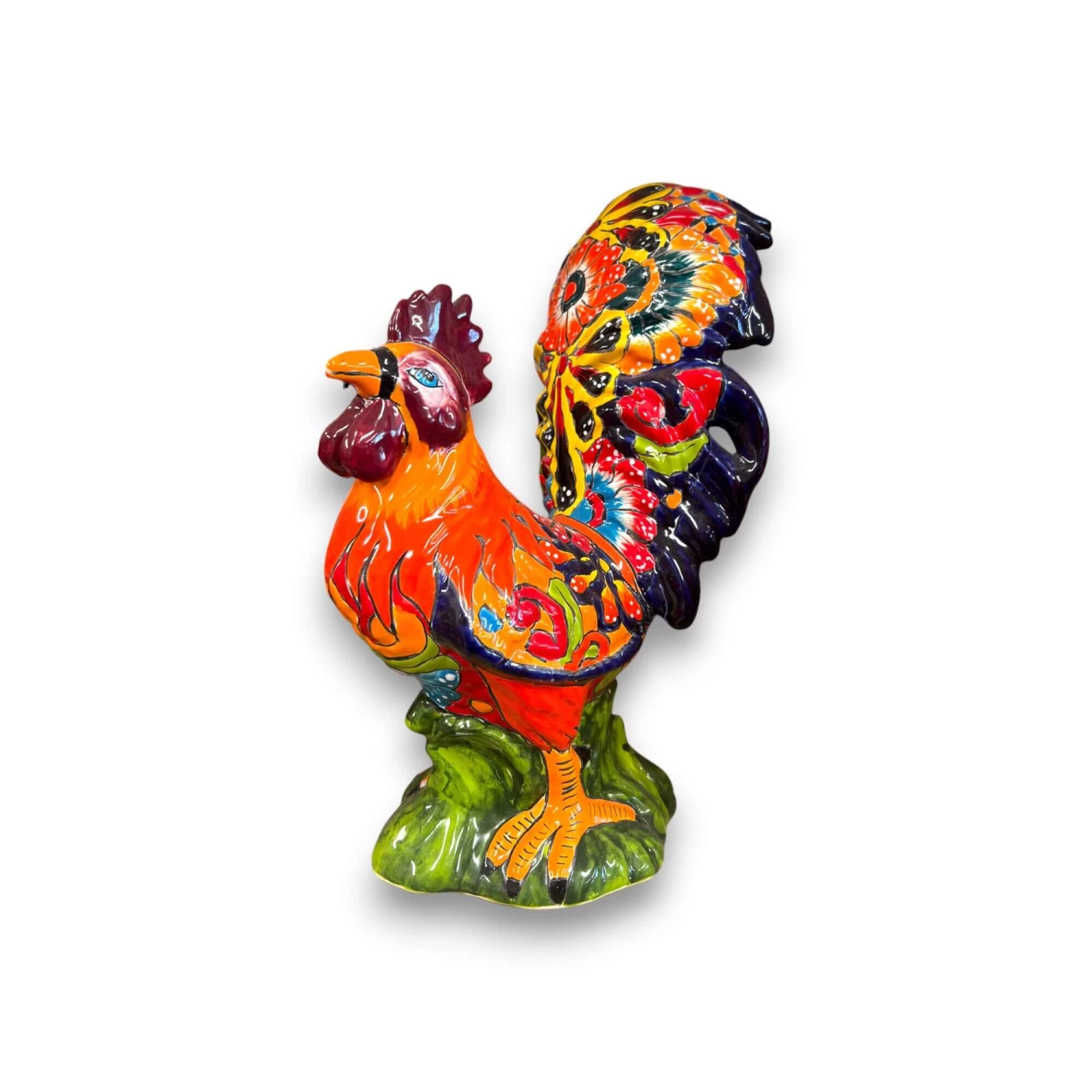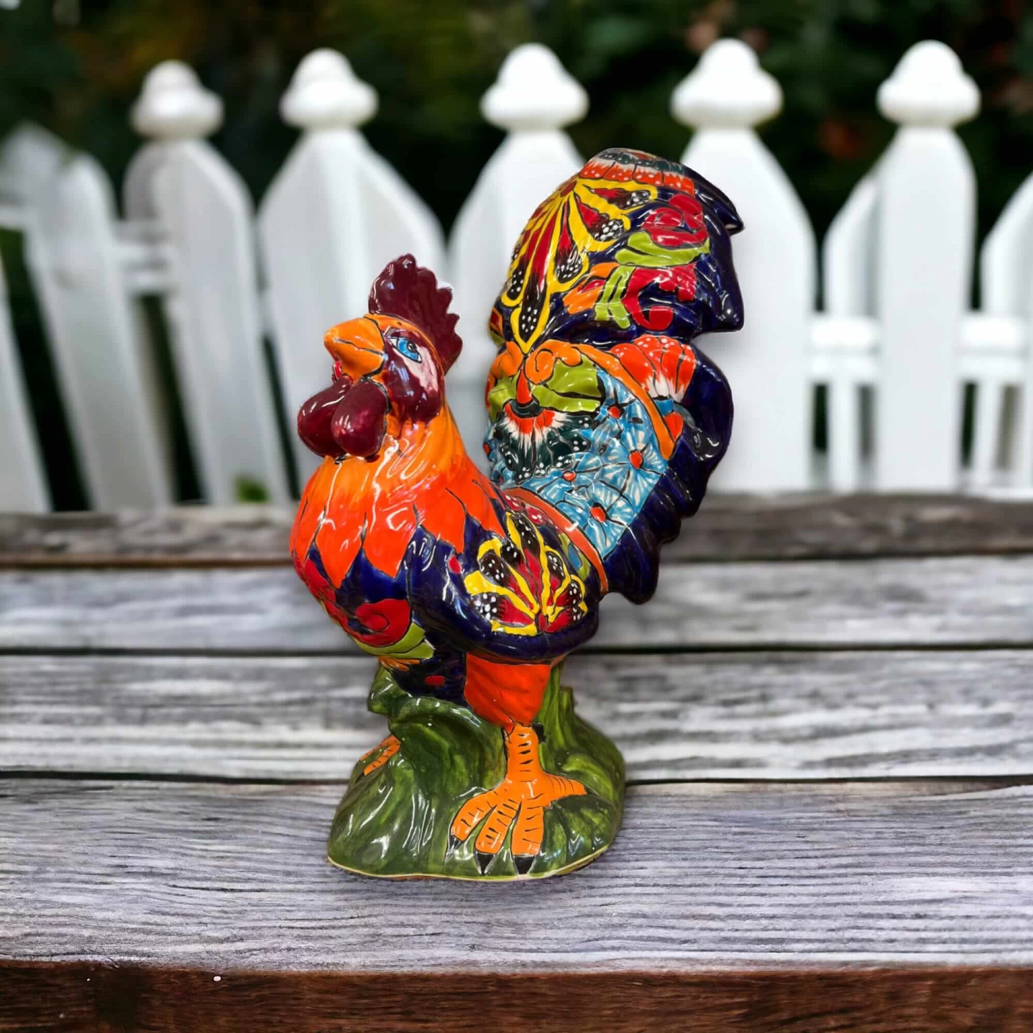 STYLE: This colorful rooster features intricate hand-painted floral and feather details in vivid shades of orange, yellow, red, blue, and green. Its proud stance and high tail make it a striking decorative piece from every angle.