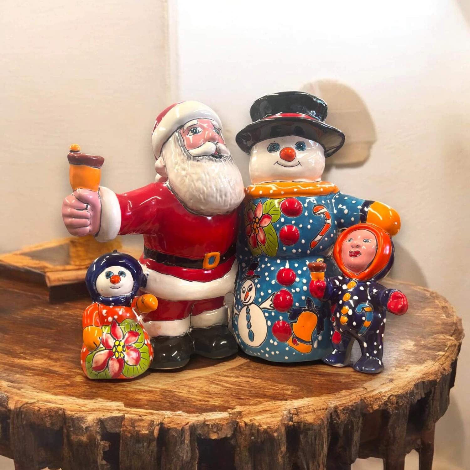 STYLE: Our Talavera Santa & Snowman Statue is a true testament to the artistry of Mexican craftsmen. Each piece is meticulously hand-painted with vibrant colors and intricate details, capturing the essence of the holiday spirit. Display it on your mantel, shelf, or tabletop to create a whimsical Christmas ambiance.