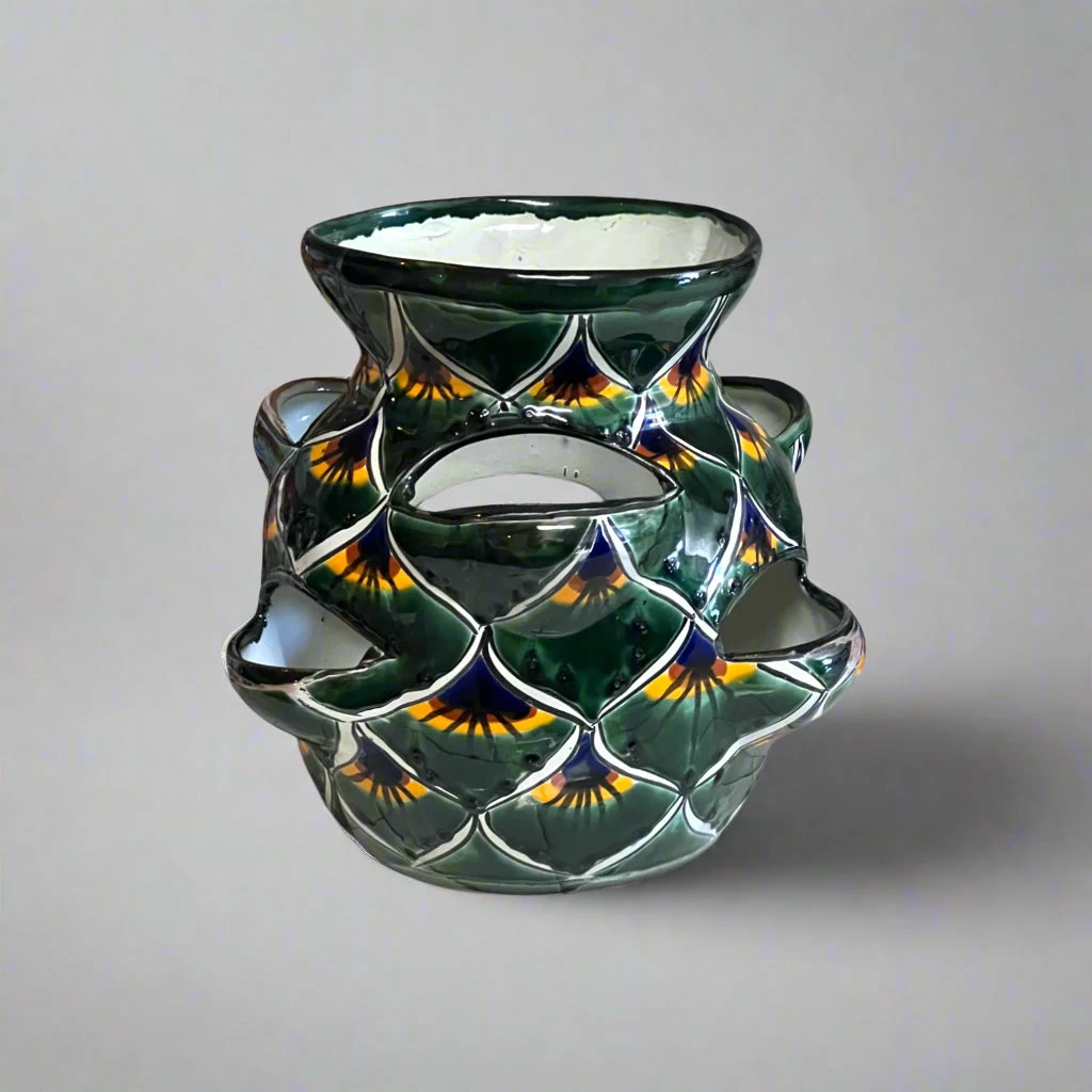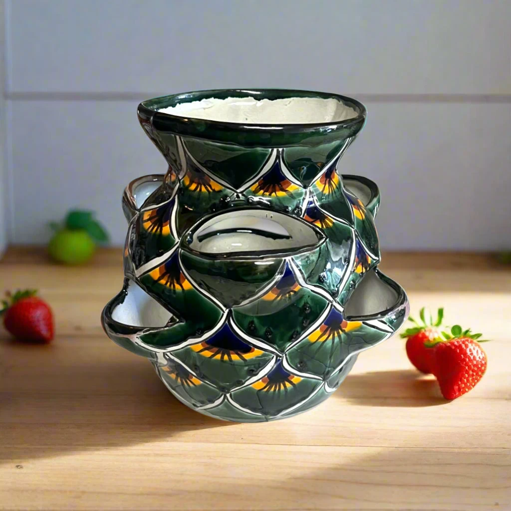 Bring vibrant charm to your patio or garden with this Talavera Strawberry Planter. Hand-painted by skilled artisans in Mexico, this piece combines traditional craftsmanship with a vibrant green peacock-style design that’s both decorative and functional.