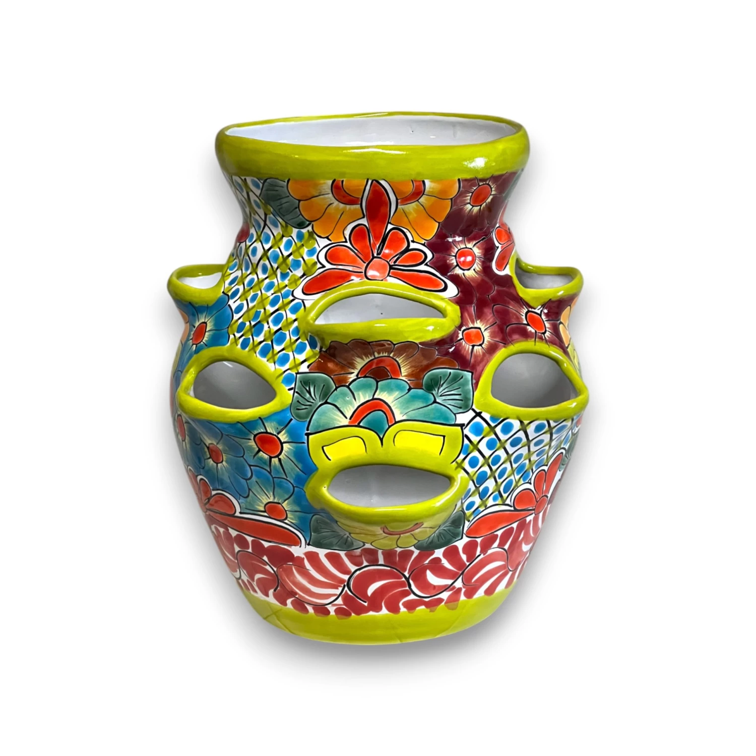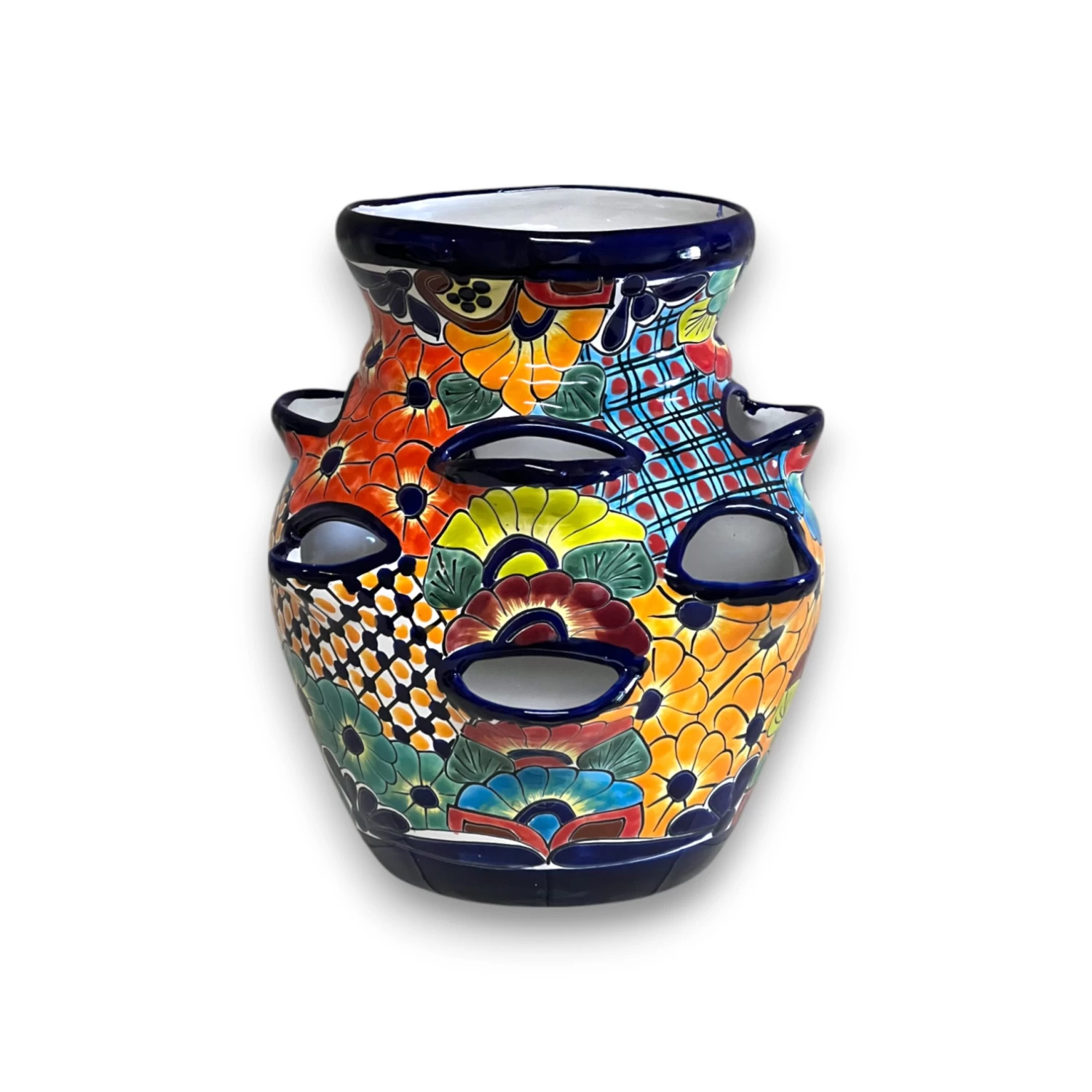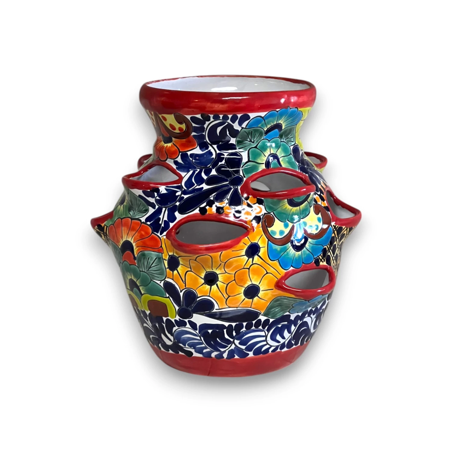 STYLE: Featuring a vivid floral and geometric Talavera pattern, this piece bursts with character and traditional artistry. The multi-pocket design is both eye-catching and functional for growing strawberries, herbs, or succulents.