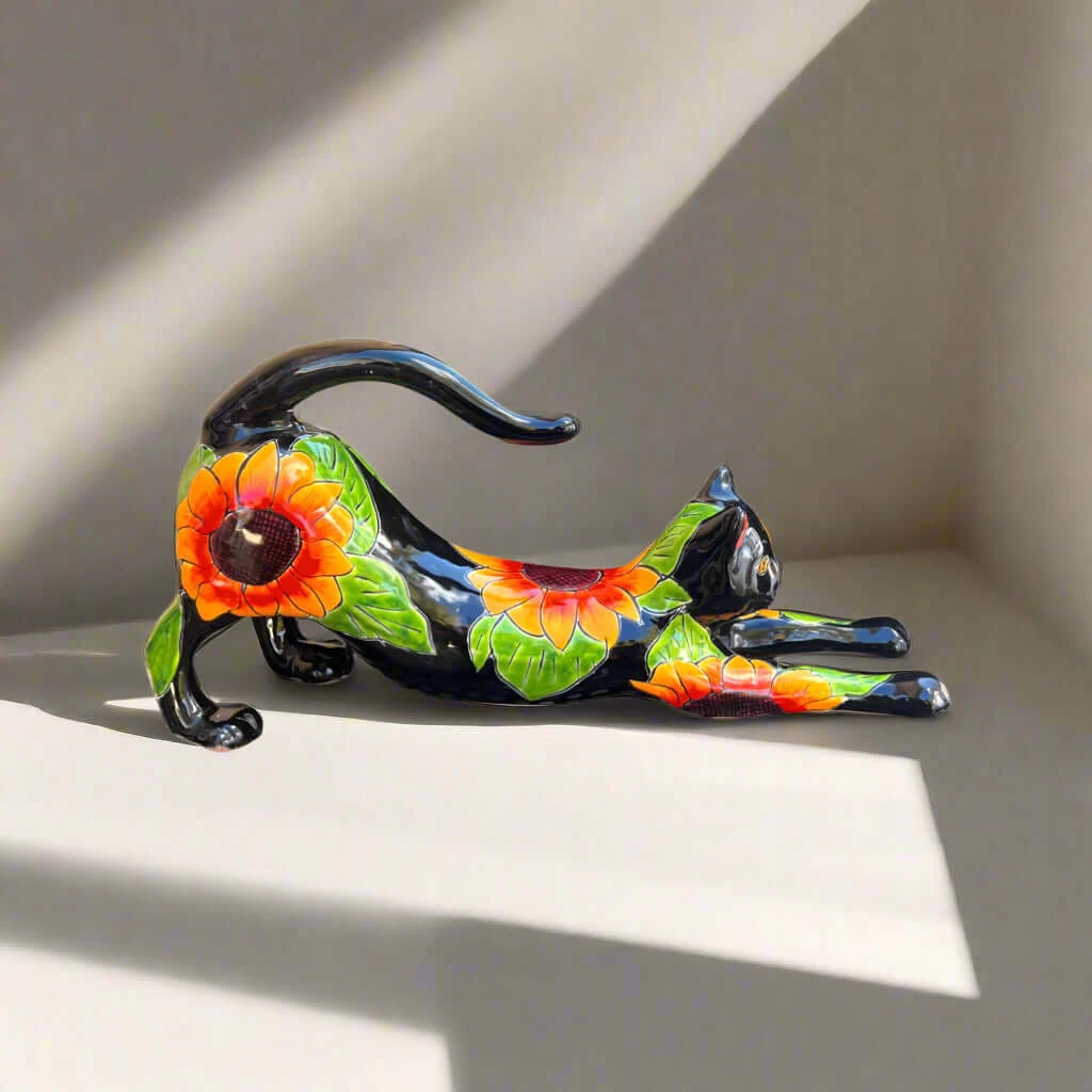 Add a playful yet elegant touch to your space with this handcrafted Talavera Stretching Cat Statue. Adorned with a beautiful sunflower design, this unique piece is carefully made by skilled artisans in Mexico, bringing vibrant colors and traditional artistry to life!