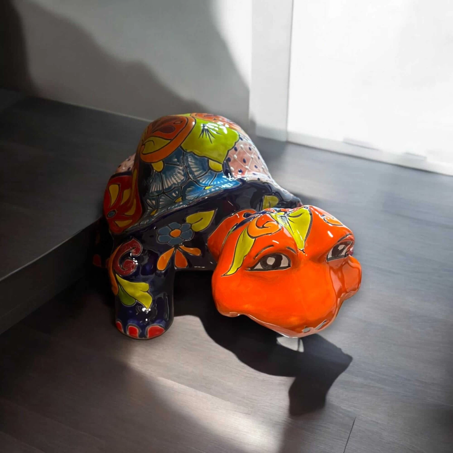 Discover our vibrant Talavera Tortoise Sculpture, a colorful addition to your decor, handcrafted by skilled artisans in Mexico. This unique Mexican ceramic turtle statue will bring a touch of traditional charm and lively color to any space.