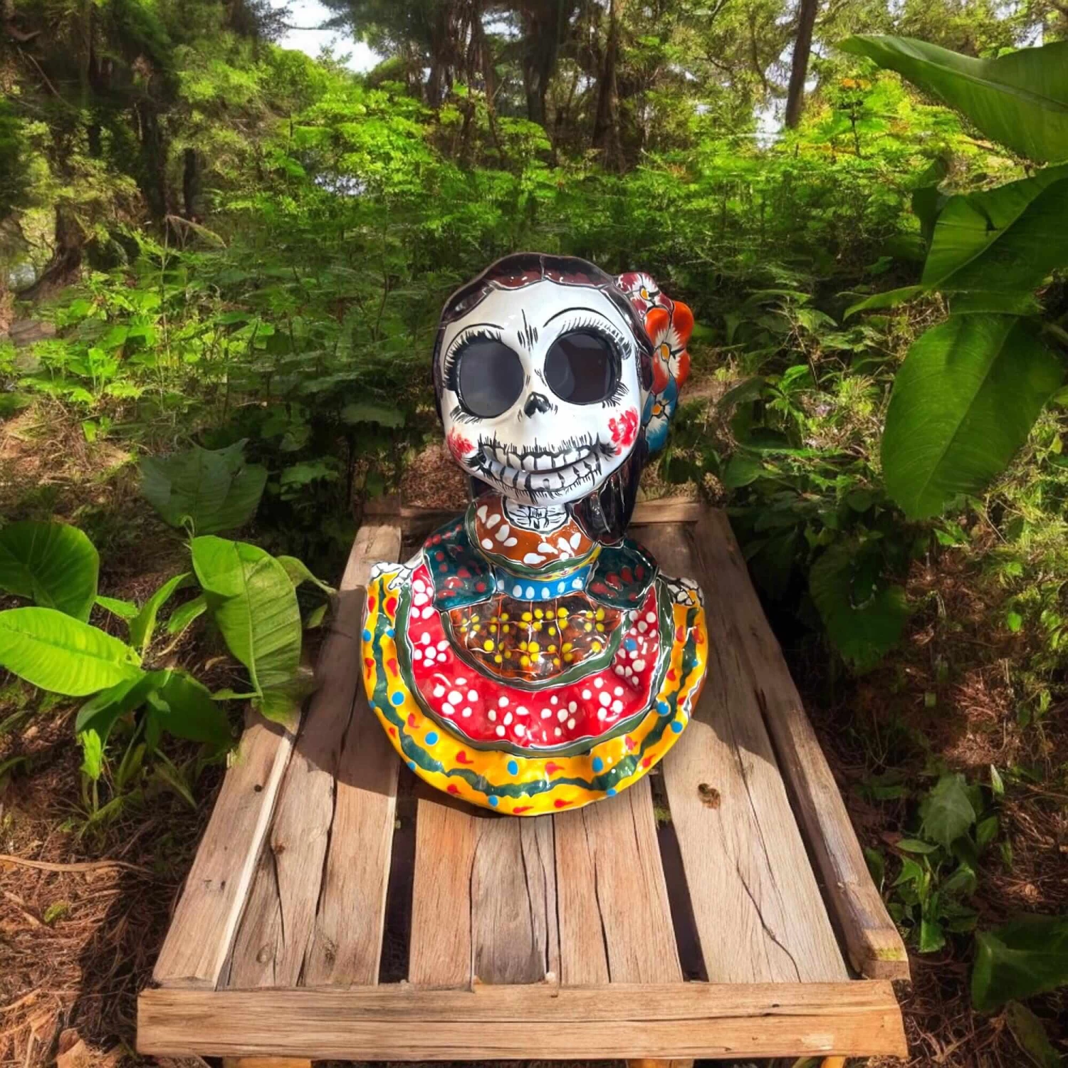 This stunning Talavera Skeleton Woman Statue is handcrafted by talented Mexican artisans. A colorful and vibrant piece, perfect for celebrating the spirit of Day of the Dead!